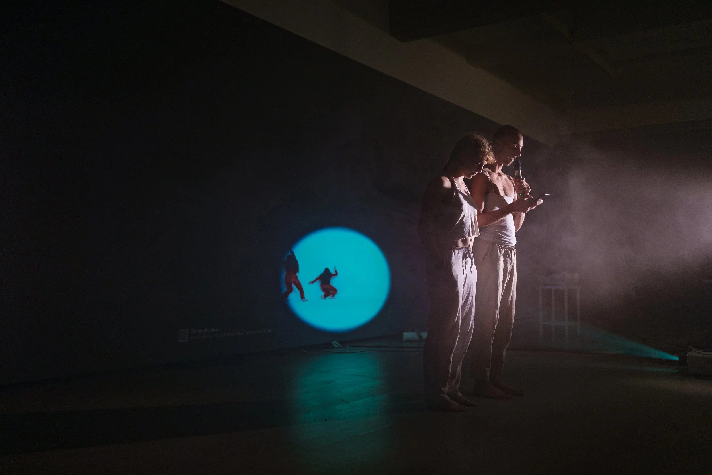 The research took its velocity through a reaction, a question, on freedom since travelling and migrating is not allowed to one of the makers who is precluded to cross European borders where she has been denied a visa multiple times. The desire to respond to this situation with an artistic and metaphysical elaboration results in the interaction of performers with beamer and livestreamed projections from Istanbul. Therefore, the research evolved into a philosophical approach where freedom is not something that can be taken away, or given, it is present at all times. It's the structural integration of the body and mind to the present moment and situation. This thinking feeds and aligns the performative expressions of the dancers, expanding towards a collective balancing and harmony. By researching on neo spiritualist philosophy we identified two migrating axes, transmitting a meaning of inner, individual and communal evolution of body and spirit. These axes are materialised as the horizontal, travelling through materiality, and the vertical which is ascending towards spiritual contemplation. In order to organise the body in relation to these two axes, we took inspiration from Ida Rolf’s structural integration research that focuses on physical elaboration of universal laws. After reading about “Structural Integration” one could claim that human evolution (physical, spiritual and intellectual) is interlinked with verticality or in other words, connected to the appropriate relationship oneself has with gravity. And similar to neo spiritualist approach, the horizontality is always in relation with verticality. Therefore to evolve to a mature understanding of the body and its manifold possibilities, a movement artist requires refined kinetics that express the unified coordination of vestibular, somatosensory and muscular systems. These basic underlying patterns govern our being and are in correlation with the external force of gravity. With this fact in mind, the act of being is more closely connected to the idea of balancing segments, rather than stabilising. This approach results in an unfolding of possibilities, which are already inherent in the human organism. That connects to the starting point of the concept where freedom is not something that can be taken away or given, but its present at all times. It is ours to organise the situation, the body and mind, from the individual to collective. All happenings, all migrations moving on earth, all thought migrations in mind, serves a purpose, and it's interconnected at all times.